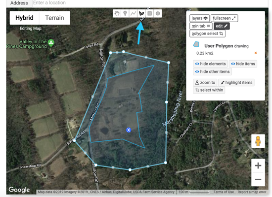 The parcel page will be opened. Using the edit button located at the top right corner of the map, reveal the selection menu and choose polygon