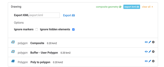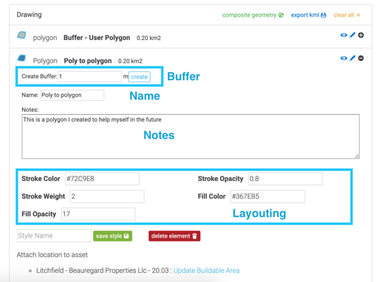 Click on the + button located at the end of the line to reveal the options to work with the polygon - define a buffer around it, name it and describe it, change it’s design, etc.