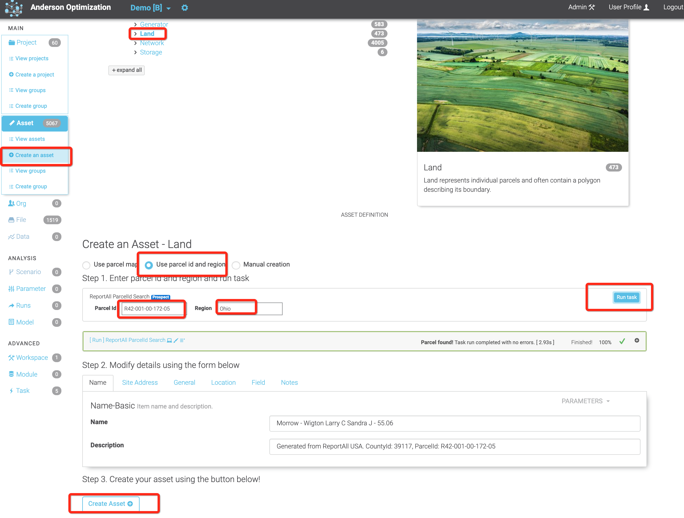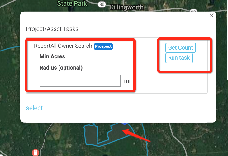 - Add an acreage (and a buffer for polyline), and use the Get Count & Run Task buttons as you would for a standard parcel search