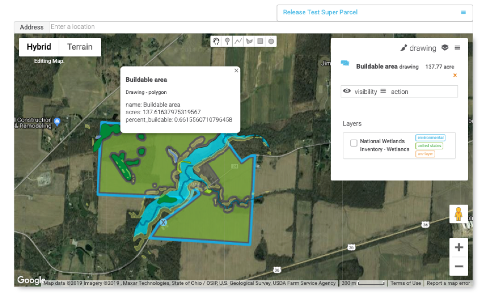 Here's an example. Our system automatically calculated that the parcel below has 137 buildable acres (no floods, wetlands, minimal slope, and 25 foot buffers) and created all of the polygons with just 1 click.