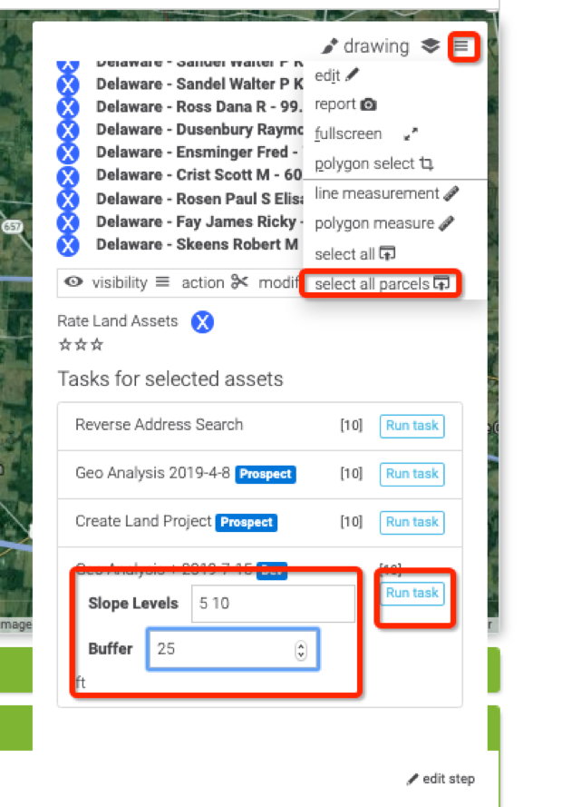 - From the project map, hover over the top right menu and click "Select All Parcels"
