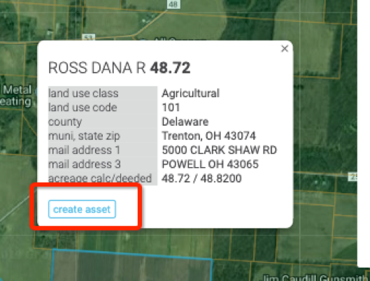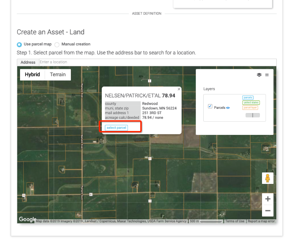 - On the map in the "Create an Asset - Land" box select a parcel from the map