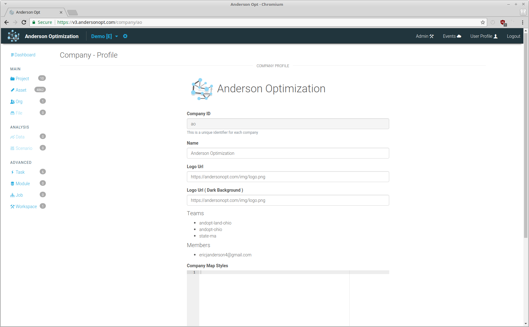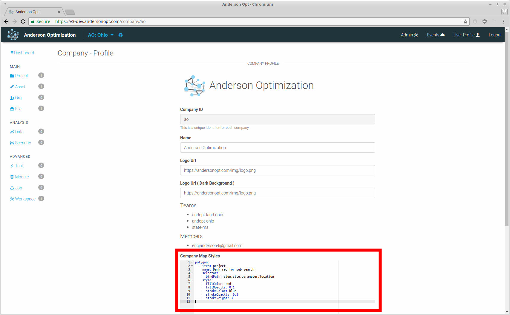 Enter company settings for your map styles. Compan settings have the second highest preference when styling a map. See more information in map configuration
