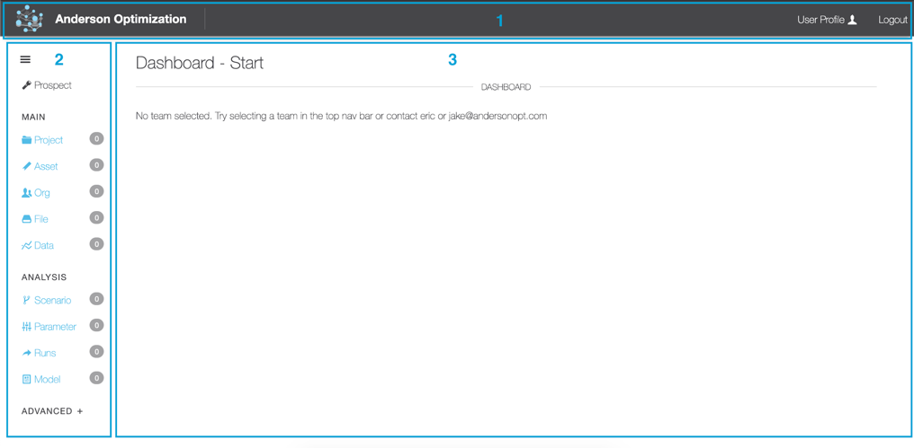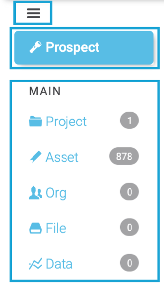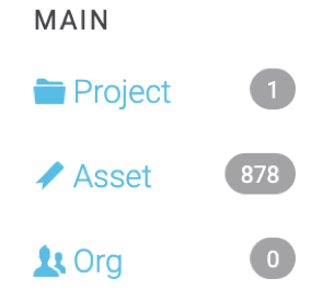 - Main navigation - Under this section, you will find the main components, including your projects, assets, organizations, files, and data. Choosing each item in the list will reveal a menu allowing you to either view existing items, or create a new one.